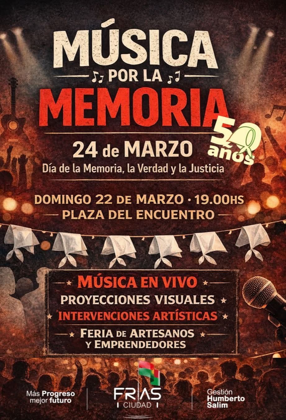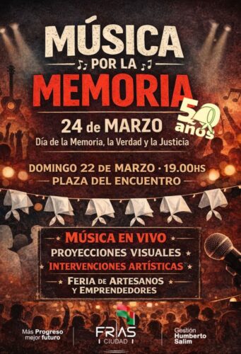 En el marco del Día Nacional de la Memoria por la Verdad y la Justicia, la ciudad de Frías vivirá una propuesta cargada de arte, reflexión y participación ciudadana con el evento “Música por la Memoria”, una iniciativa impulsada por la Municipalidad local.