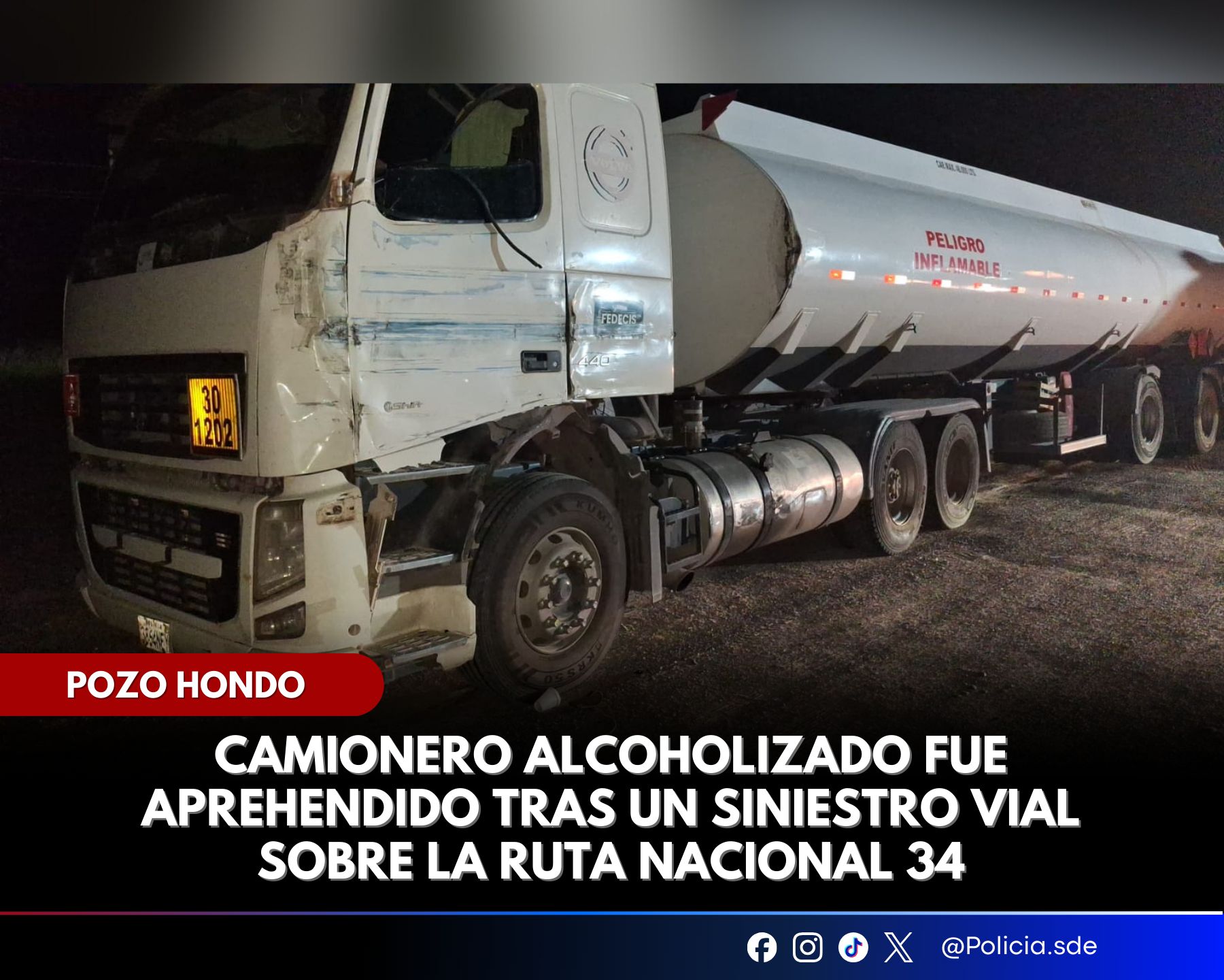 Tras tomar conocimiento del hecho, personal del Puesto Vial Pozo Hondo intensificó los controles preventivos sobre la traza nacional con el objetivo de localizar al camión involucrado que circulaba con sentido norte. Como resultado del operativo, el rodado fue ubicado cuando ingresaba a una estación de servicio cercana a la ciudad de Pozo Hondo.
